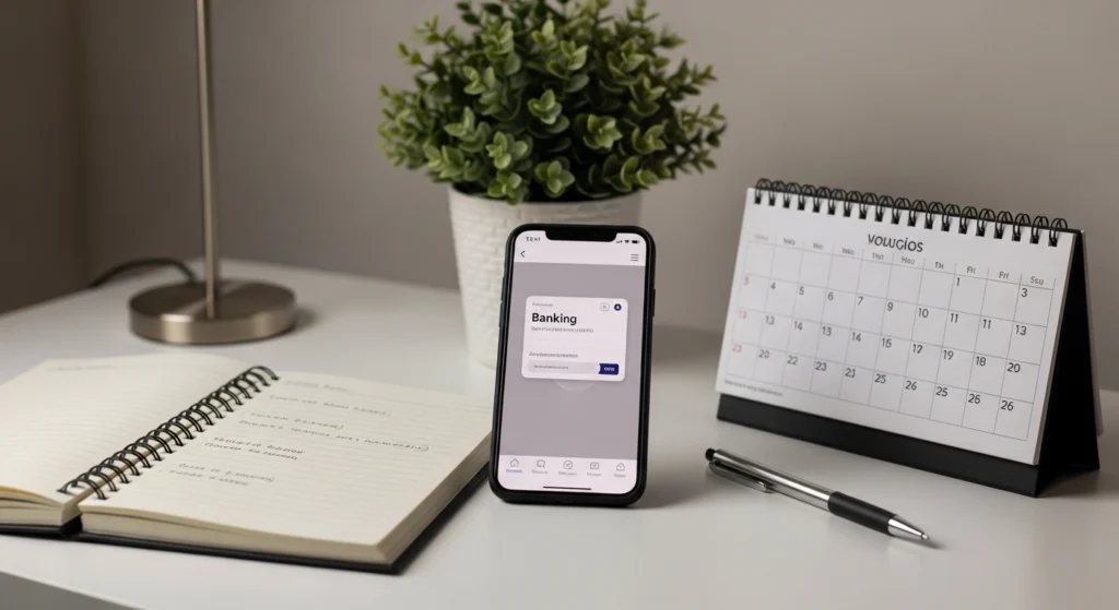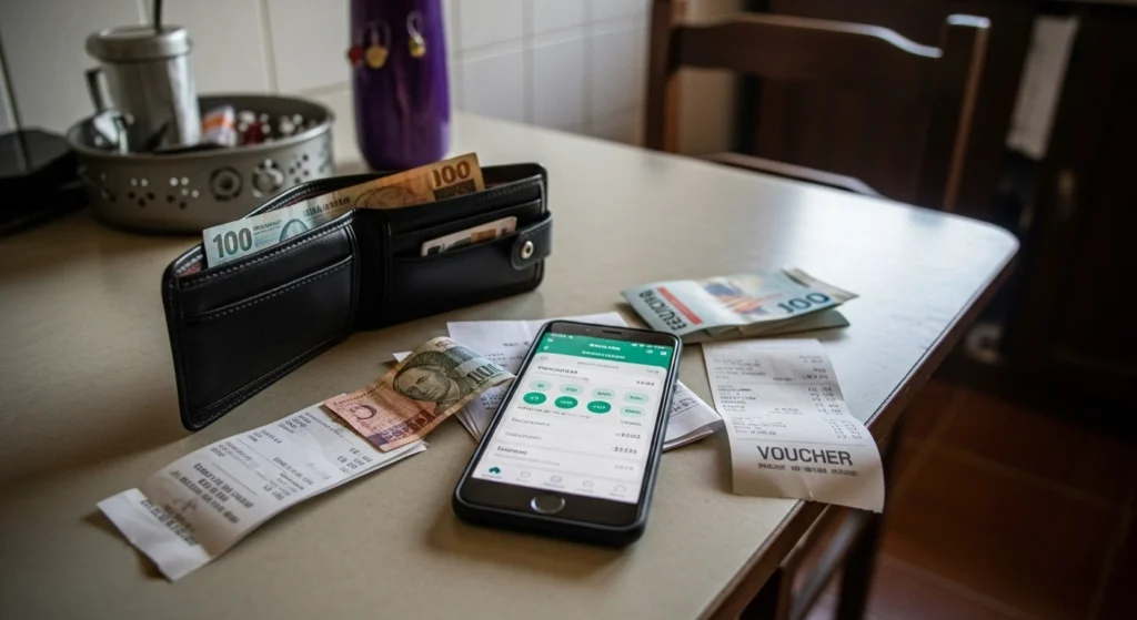 A imagem simboliza a manutenção do controle financeiro mesmo em períodos corridos. O ambiente organizado, porém simples, mostra que não é preciso um sistema complexo para acompanhar entradas e saídas. A cena reforça a ideia de rotina mínima e constância, onde pequenos registros frequentes evitam acúmulo de informação e perda de controle ao longo do mês.