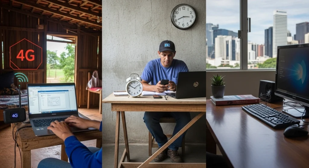 A realidade muda muito entre capital e interior, e entre quem tem banda larga estável e quem depende de internet móvel. Isso influencia o tipo de atividade, o canal de divulgação e até o horário de contato.